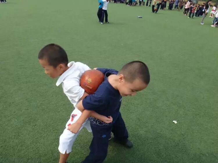 宝宝和家长一组,背靠背运球,同时出发,最快到达终点的一组获胜。